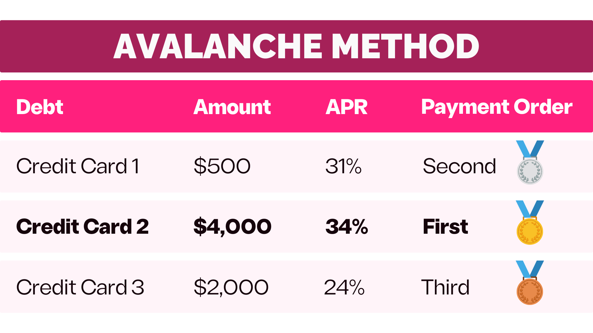 Let’s look at the example below. With the Avalanche Method, you’d pay off Credit Card 2 first, then Credit Card 1, then Credit Card 3…because that’s the order with the highest APR.